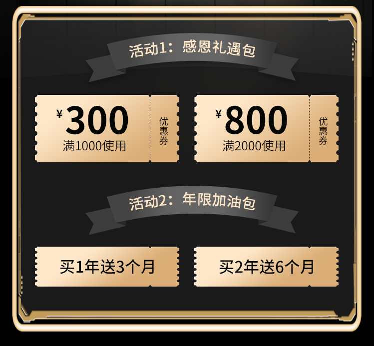 不仅如此,再告诉你一个好消息,我们申请到了年终的最后一波福利,大额满减券、超长使用年限任你挑选!活动力度有多大呢?错过了,会让你追悔莫及的那一种。